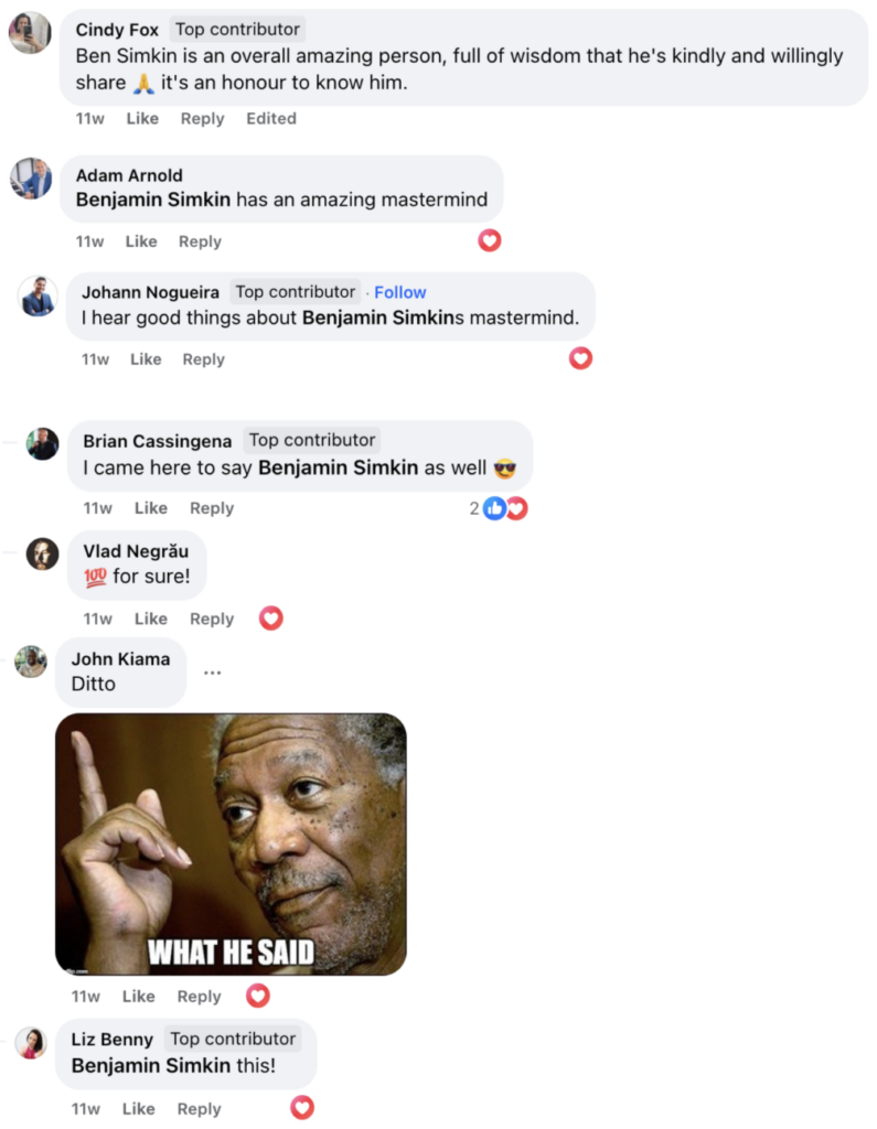 Ok... Where to begin. Authenticity - everything that is shared, taught, revealed in the Mastermind has not simply been lifted from a book rather is the result of many years of Ben Simkin and his incredible team of mentors actually running multiple (multi million dollar) businesses in the dirt. There is no snake oil here or faux friendships to make you feel like 'part of a herd'.. Instead real care, support and an absolute desire to see you succeed.