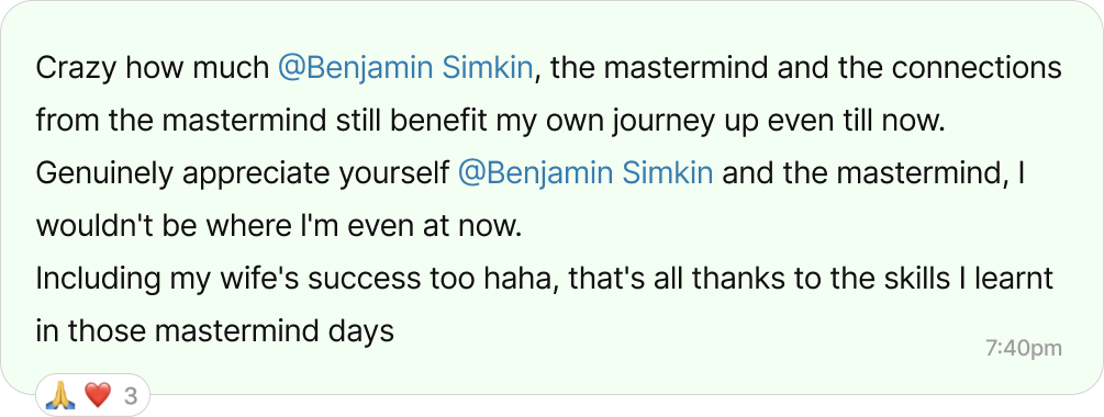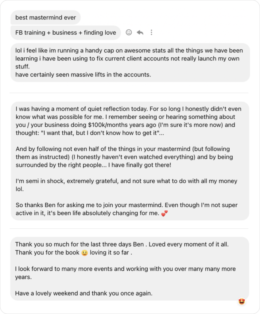 LOVE this Mastermind! It's been so helpful to me and the other members as well. Ben's insights and advice helped one of our members get an $80,000 / month (ongoing) deal, another member literally upped their profitability 7 times in two months... My own client selection & intake process has changed and now I'm only working with people that are truly amazing and inspiring. Love this group! Thank you Ben 🙂