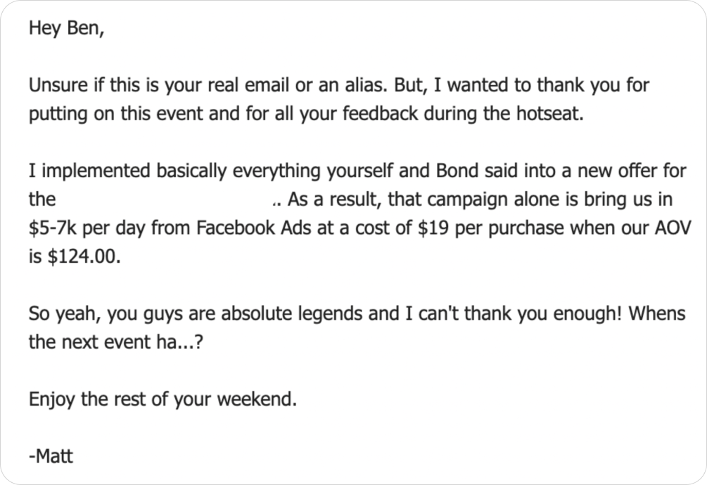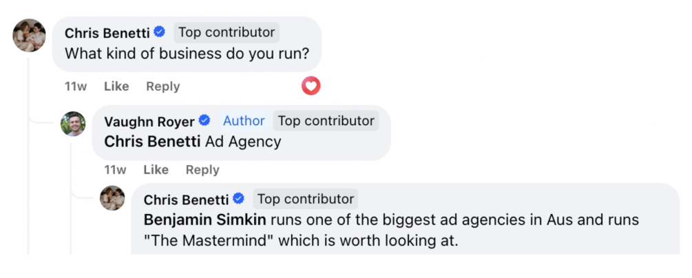 Unbelievable content and input from Ben. He goes way above and beyond to help all members achieve their desired outcomes. The way he gets you thinking about your target market and how best to not only talk to them, but help them is astounding. Love being part of the Mastermind!